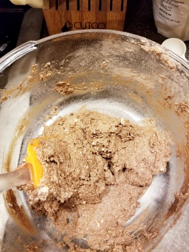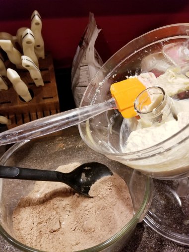 Add two tablespoons of nondairy milk and mix until all incorporated; there should be no “dust” from the ingredients left. If necessary, add more milk little by little to help blend dry ingredients. Then add your tofu mixture to the flour mixture.