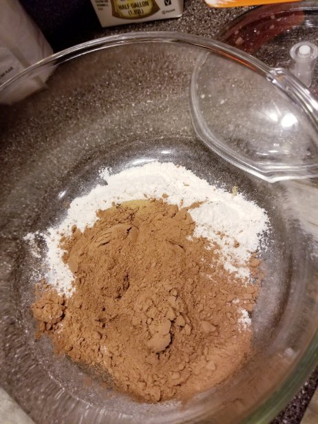 In a separate mixing bowl, mix flour, brown sugar, cocoa powder, and baking soda.