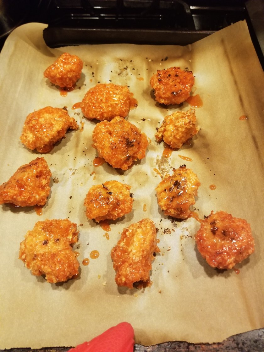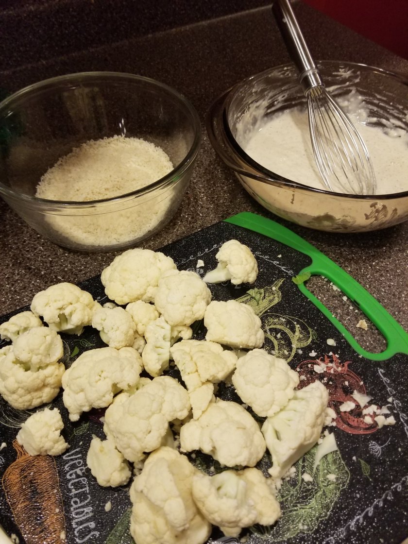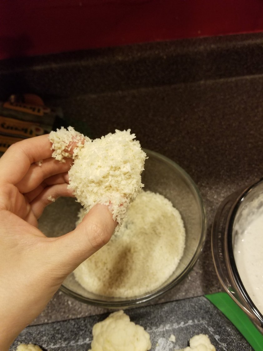 Obviously, making “wings” out of cauliflower isn’t going to yield that traditional taste regular wings have, but that’s ok! These cauliflower wings can stand alone. I have tried several different recipes for these, but I finally found a recipe backbone that I modified to make my own and I think it’s a winner! The batter isn’t too thick, so you don’t bite through a bunch of it to get to the cauliflower, itself. The best part? They are breaded in panko to give a delicious outer shell of crispness. This recipe will serve 2-3 people. If making for a small group, I suggest doubling it!