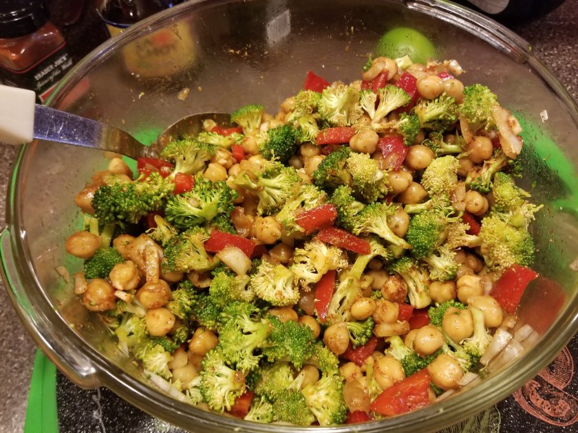 Cut up the onion, bell pepper, and broccoli to the approximate size of the chickpeas. Put them all in a large bowl and pour in olive oil and soy sauce. Stir well. Throw in all of the spices and mix until everything is covered. Isn’t it such a pretty sight!?