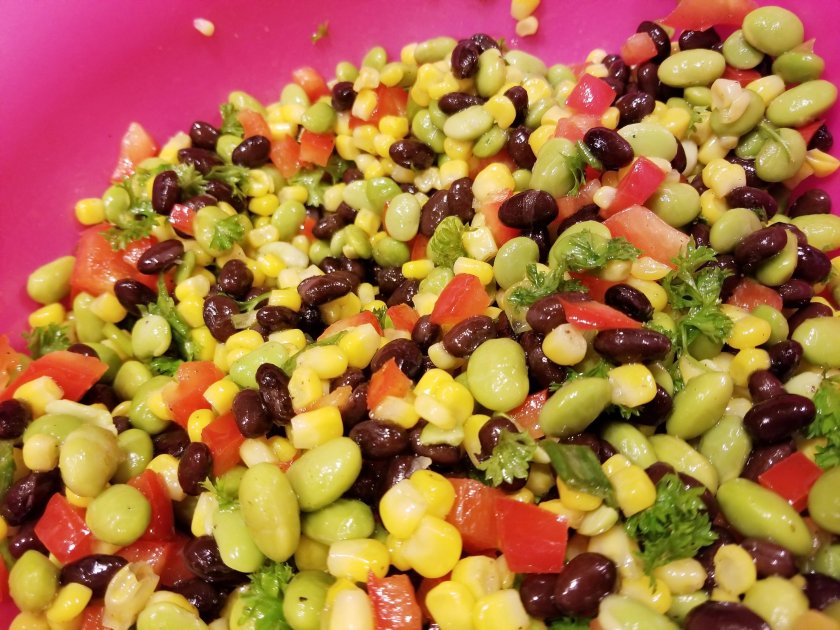 This is a great side dish to take to cookouts or family gatherings. It’s so simple and modifiable! It’s naturally gluten free, too. This makes about 10-12 servings.Ingredients: 3 cups corn (frozen or fresh) steamed3 cups edamame, shelled (can also be fresh or frozen) steamed1 red bell pepper1/2 cup green onion1/2 cup red onion (optional)1 can black beans, drained and rinsed (optional)1/2 cup fresh parsley, chopped1 tablespoon Agave1/4 cup olive oil1/8 teaspoon cumin1/2 teaspoon pepper1/2 teaspoon saltJuice of one limeDirections: Steam corn and edamame until tender. If frozen, about 20 minutes.