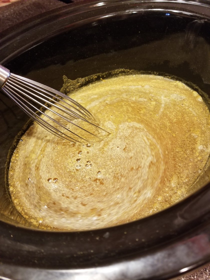 Whisk together all the ingredients from garlic to black pepper to make the broth base for your veggies. I do this directly in the crock pot.