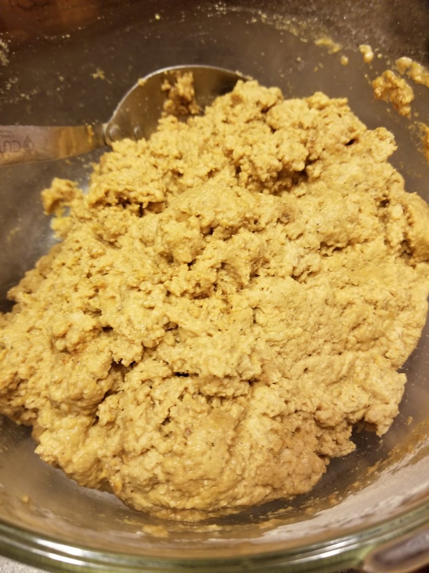 Mix well. There should be no dusting of flour, but the dough should not be too wet either. You can adjust accordingly by adding a bit more vegetable broth or a little more flour, if needed. You should be able to pick up the ball of dough without it falling apart completely. Knead the seitan for about 3 minutes.