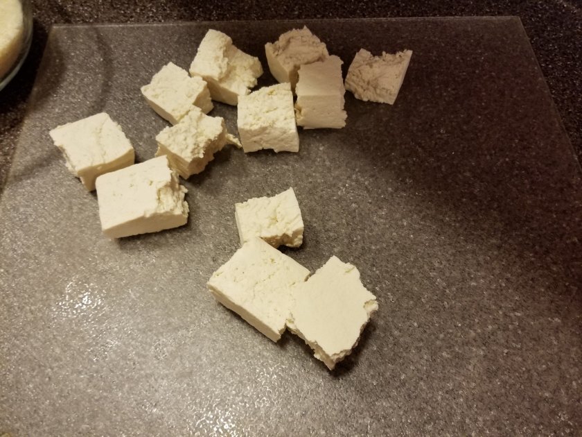 Tear tofu into equal pieces. I got about 12 out of each block.