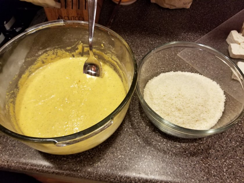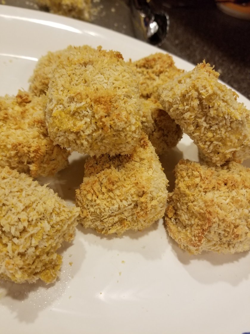 Fast forward to early this year when I found an amazing popcorn tofu recipe to put the new air fryer to good use. These delicious tofu nuggets give new meaning to the phrase “tastes like chicken.” The inside is soft, while you get a really crunchy, flavorful outer shell from the batter and breadcrumbs. While it may not exactly be chicken, you probably wouldn’t know it was tofu unless someone told you! You can make the pieces as small or as large as you like. I usually break the tofu apart to get 12 per block. It’s possible to make them even smaller to get the full “popcorn” effect, but I found I risked the tofu crumbling, even when using extra firm. Besides, bigger pieces means you don’t have to reach for more as many times. š I like to make 2 blocks, because you really can’t have enough of this, but you can halve this recipe and make enough for 3-4 people. It just depends how hungry your crowd is!