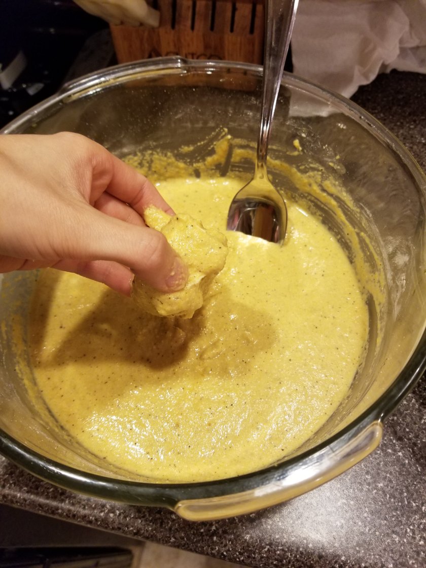 Mix all ingredients except panko in a large mixing bowl to make the batter. It will be pretty thick.