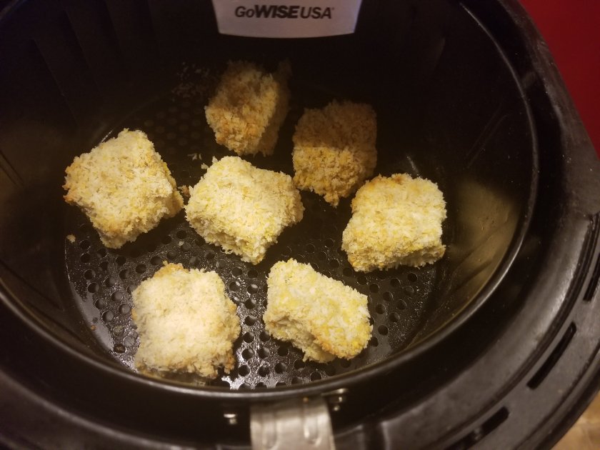 Cook in your air fryer for 12 minutes, pulling the basket out and shaking halfway through. Continue until all your tofu is battered and cooked.