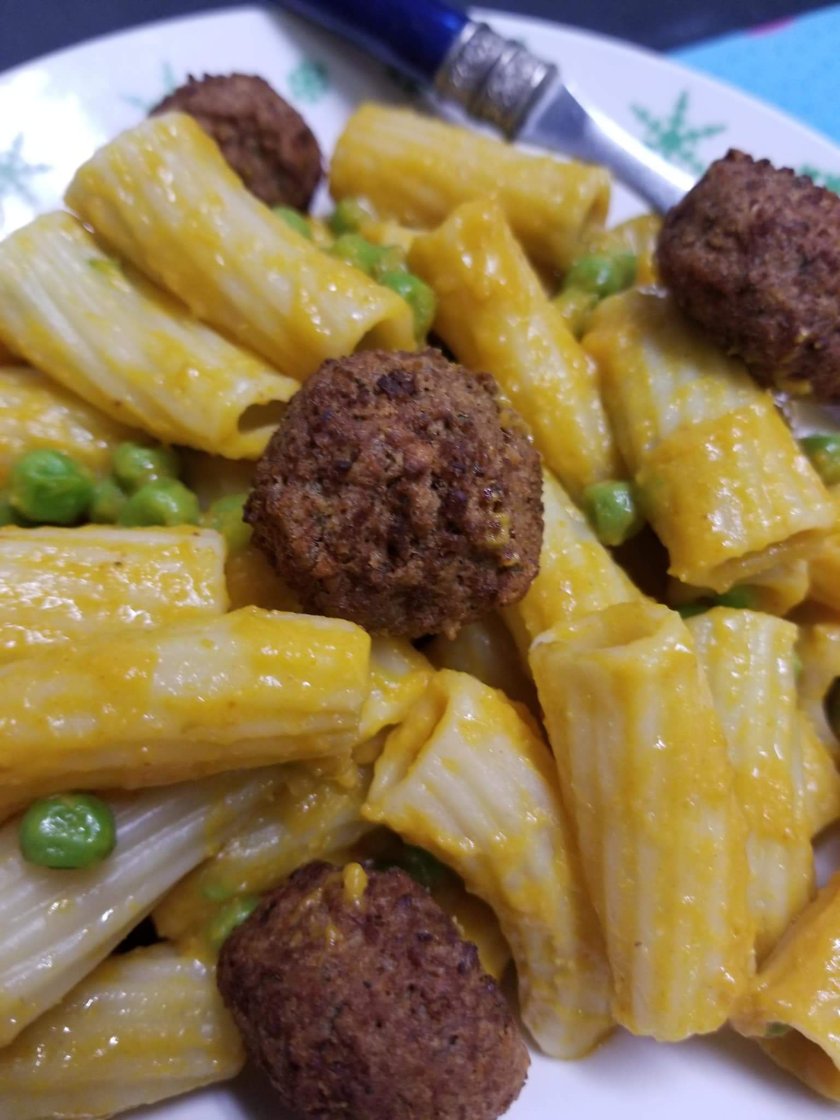 I added peas to mine since I love a good veggie pasta combo, but you can omit them, or add really any vegetable you want. I also topped this dish with Gardein vegan meatballs for some added protein and to appease the husband!