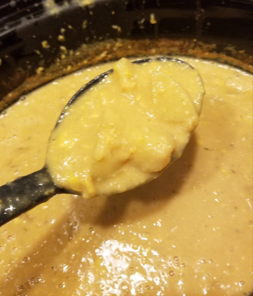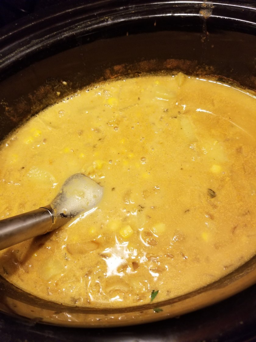If you don’t have an immersion blender, that’s ok, you can either spoon half the soup into a regular blender, blend, and then pour back in your slow cooker, or not blend any soup at all.