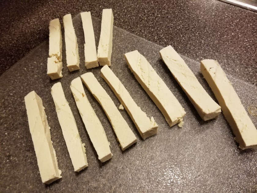 After draining the tofu, cut it into 6 pieces widthwise, and then cut each of those in half; you should get 12 sticks.
