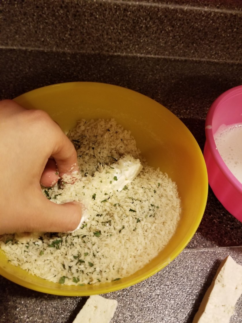 Dip the tofu, one at a time, first into the cornstarch, then into the the almond milk, then into breadcrumbs.
