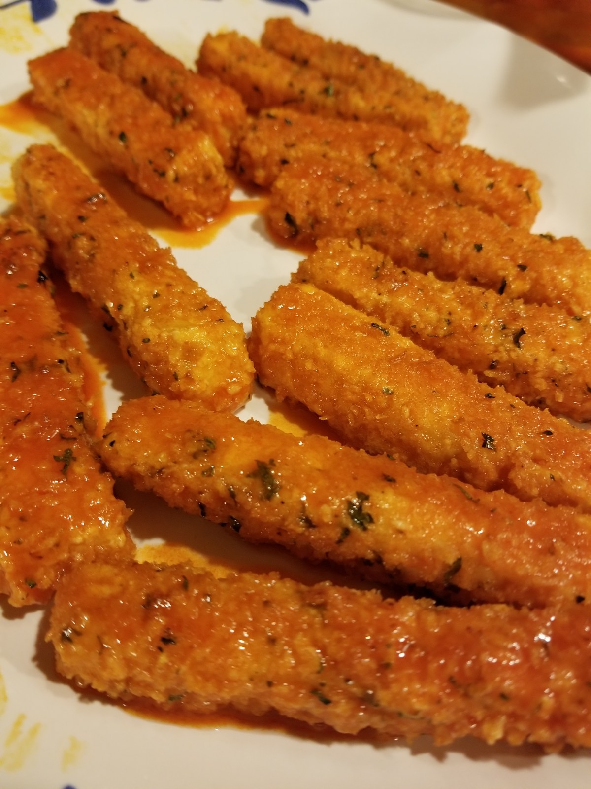 Still think you don’t like tofu? Think again! When I originally set out to make these, I figured I would eat a few, but it would mainly be a dish my husband would love. I was pleasantly surprised! These tofu sticks are slightly crispy on the outside and full of spicy, buffalo flavor. They were so much better than I even thought they would be! The ratio of breading to tofu is perfect and I guarantee you won’t even remember it’s tofu. One tofu block will give you about 12 sticks. We like to dip these in Just Ranch and serve as a side to a nice baked potato and a green vegetable. 😋