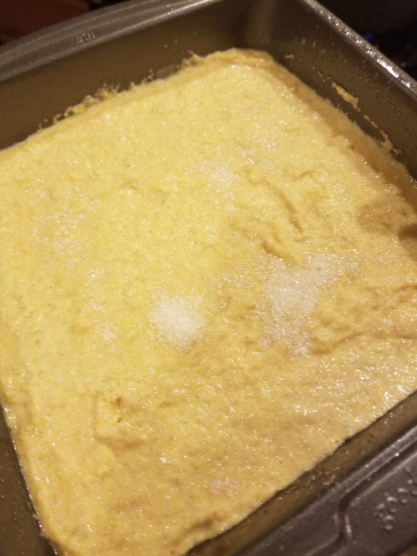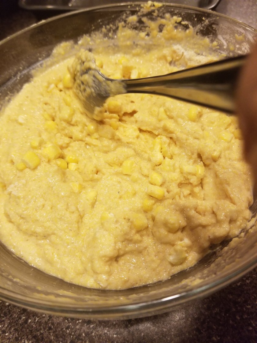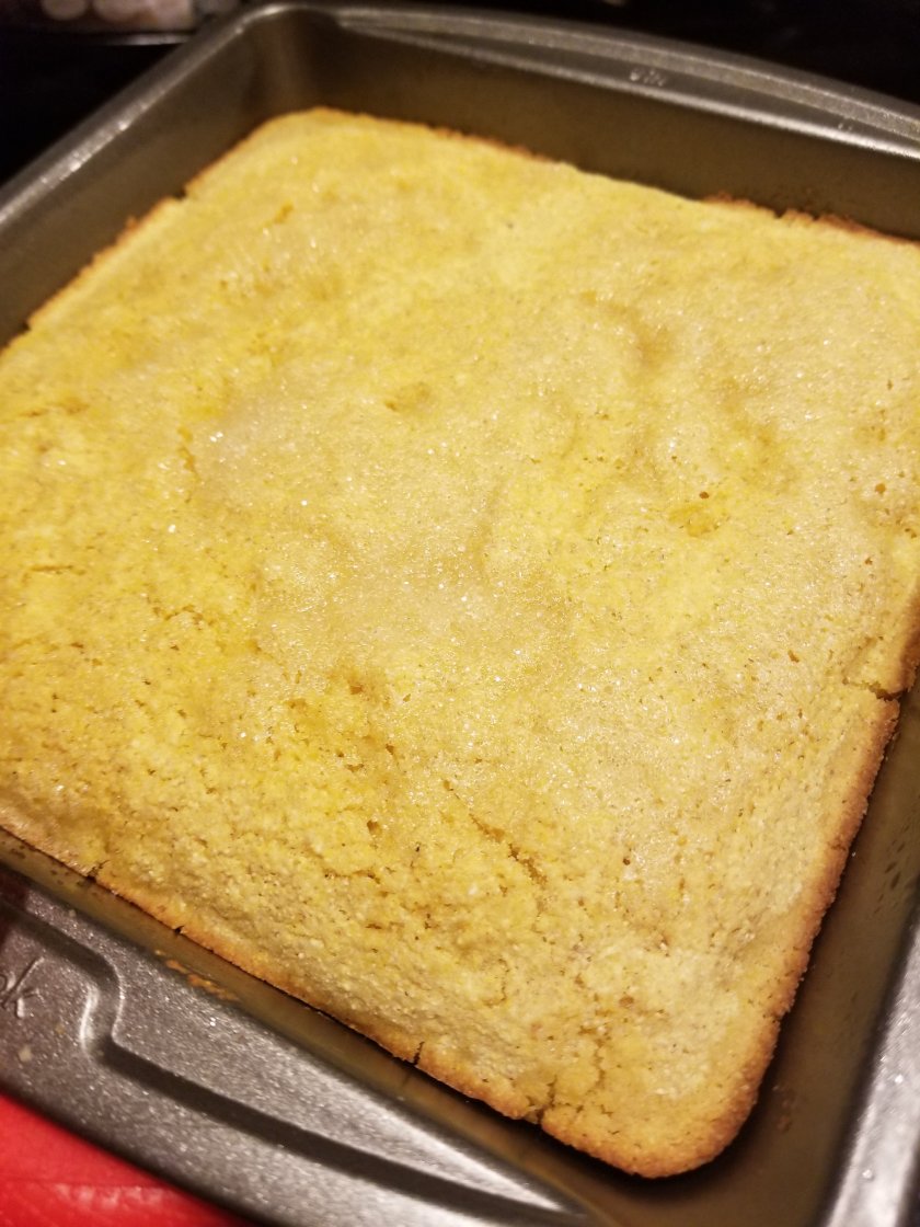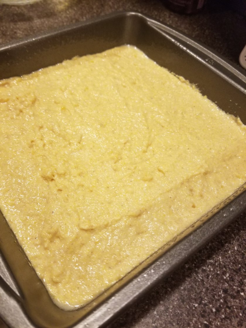Spray a 9×9 inch baking pan well with cooking spray and pour the cornbread mixture in, evening and smoothing the top with a spatula.