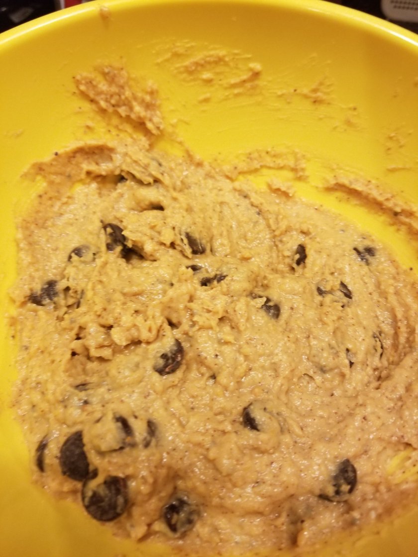 Blend until the consistency is smooth. This might take a few times of stopping and scraping the sides, but you really want it to be as smooth as possible. Pour into bowl and add chocolate chips.