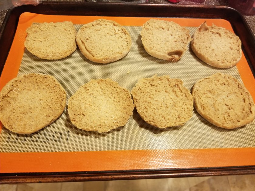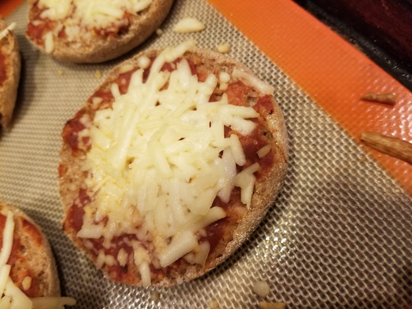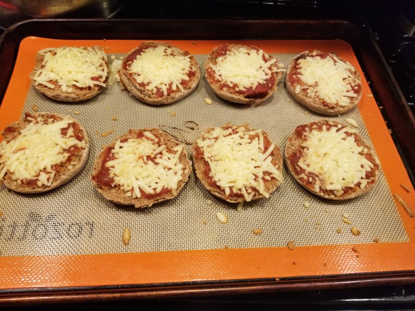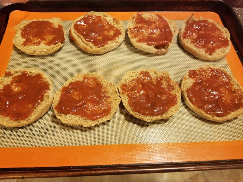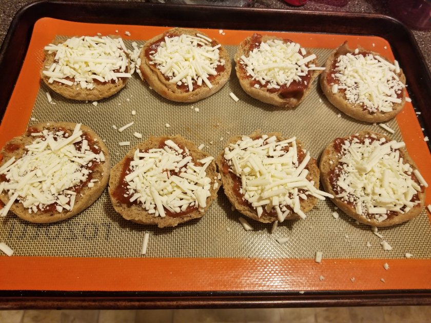 Open English muffins and split in half. Place on baking sheet. Each muffin will give you two pizzas. I usually make 8 pizzas at a time.