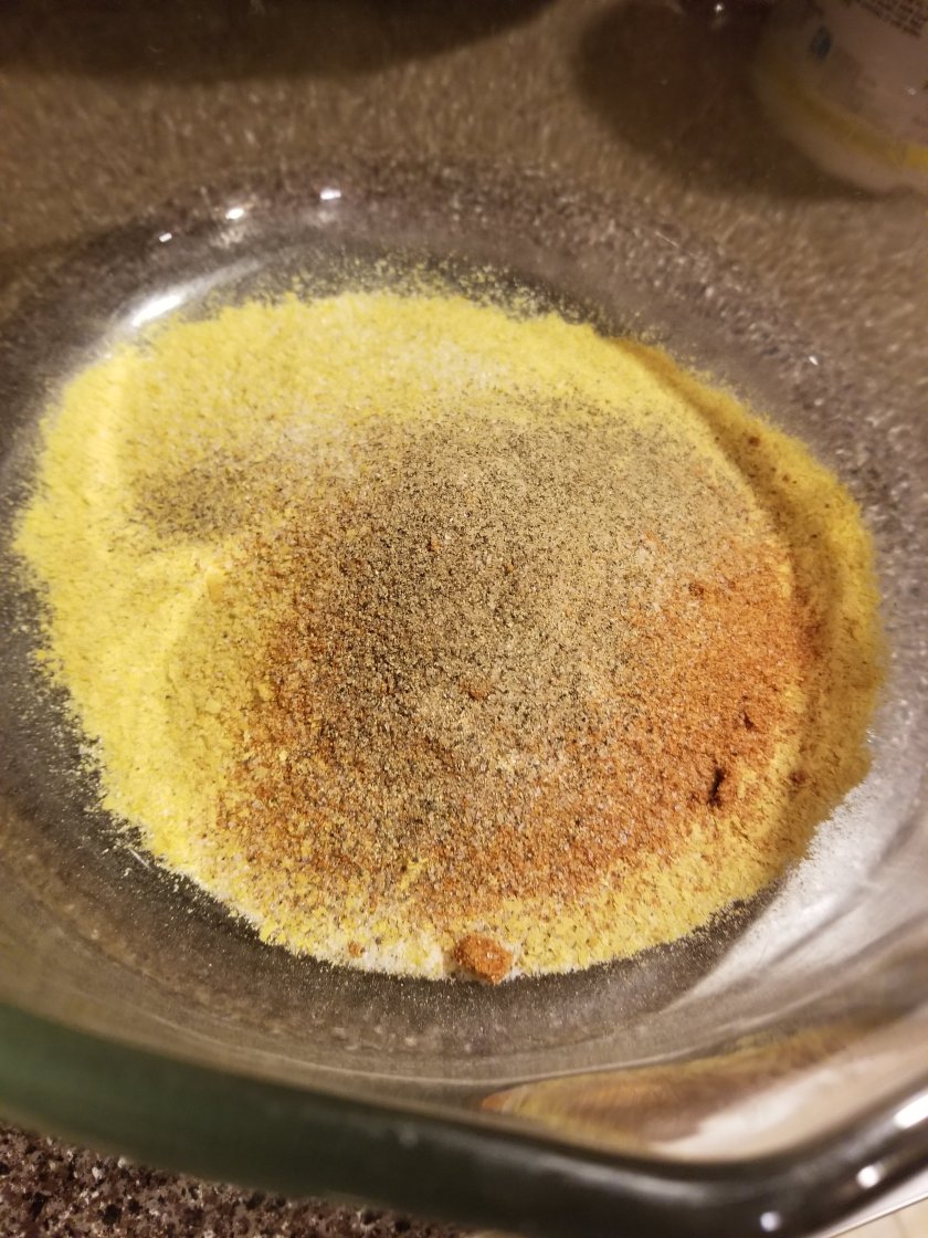 The bottle he bought was much smaller, but after we ran out, I quickly realized you could buy a big bottle on Amazon. It’s pretty good stuff! It’s got a bit of a kick, so use it sparingly if you don’t love spicy foods. I added it to my chili a few weeks ago and it was perfect! Since it’s just an ingredient in the batter here, don’t worry about using the full amount; the spice won’t overwhelm you! You can also use any Cajun seasoning you’re already used to!