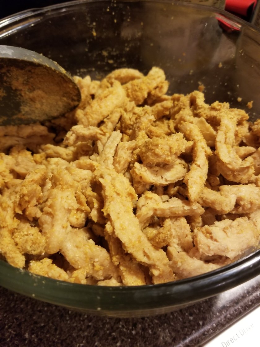 After draining your soy curls, (make sure to get as much water out of them as possible), pour them into the batter mixture and stir well, making sure every piece is coated.