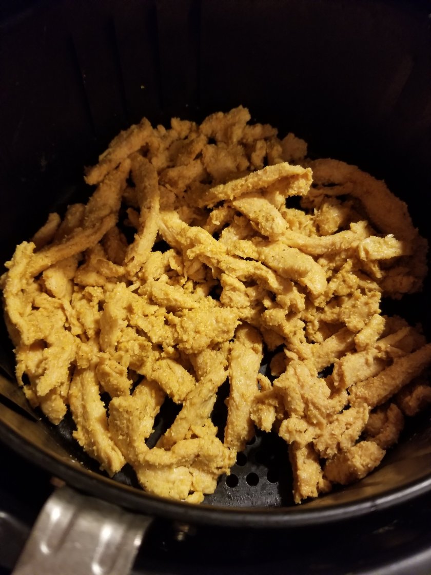 Place in the air fryer in a somewhat single layer. A little overlap won’t be detrimental, but you don’t want too many soy curls in there. You might have to load your air fryer a few times to fry them all, depending on the size of your fryer.