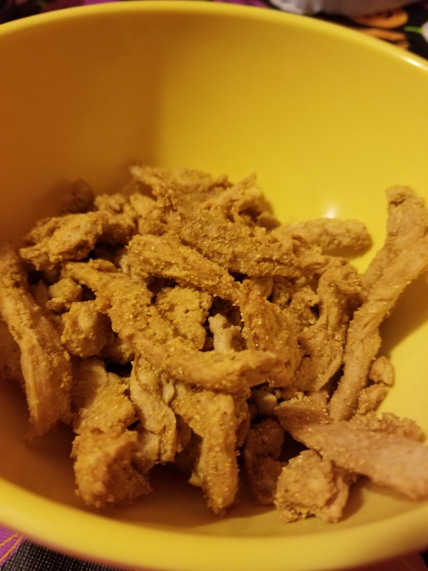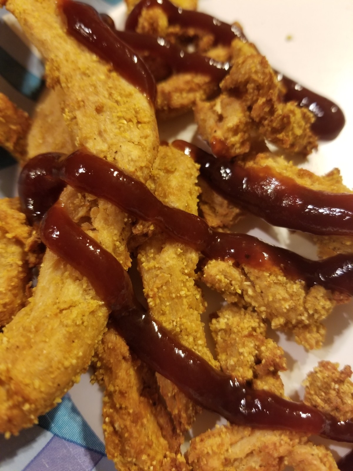 That’s it! They will come out crispy and delicious! I pour mine into a serving bowl and continue the process with the remaining curls. Our favorite sauce to pair these with is BBQ, but a nice vegan ranch would be good too.