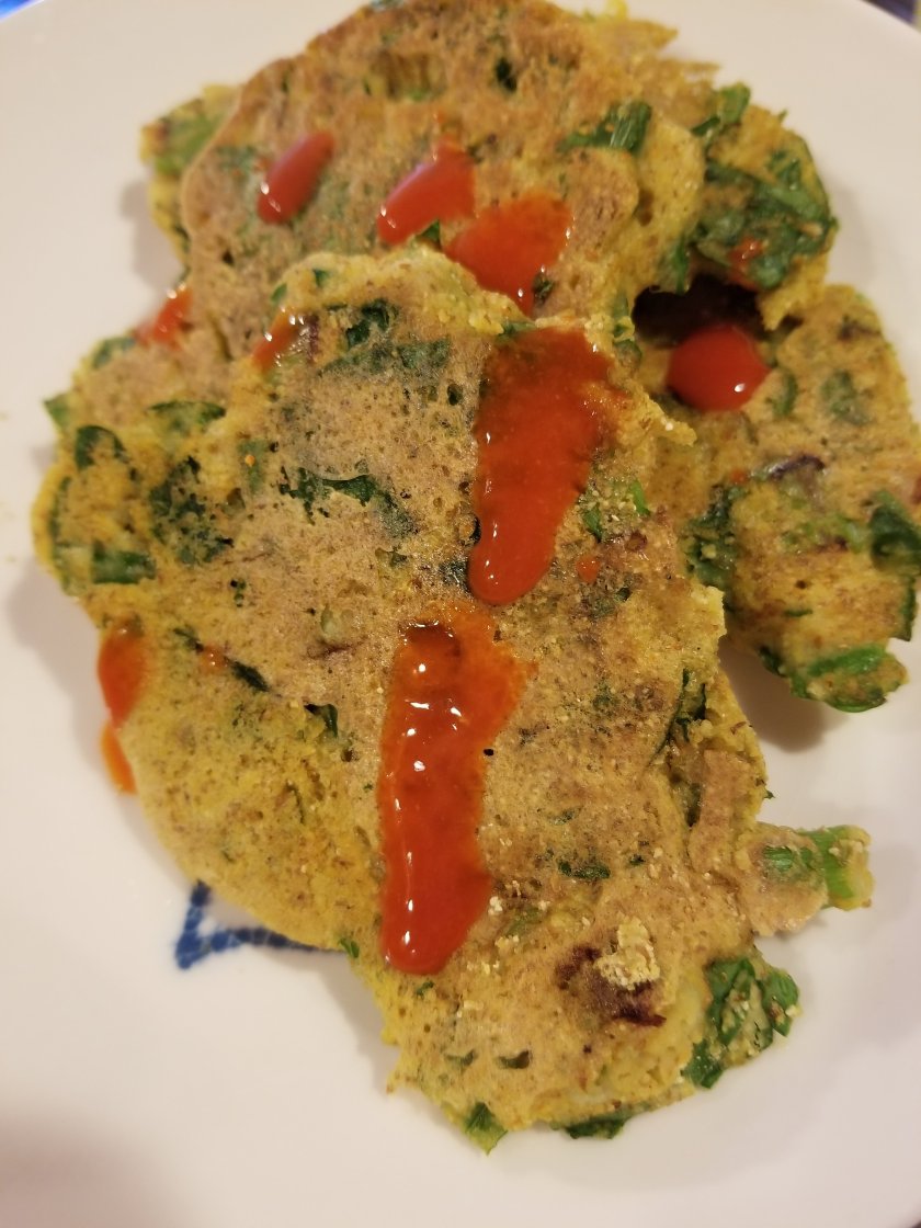 Add spinach, scallions, and hot sauce and mix well. Add cayenne for a spicier pancake, or more hot sauce.