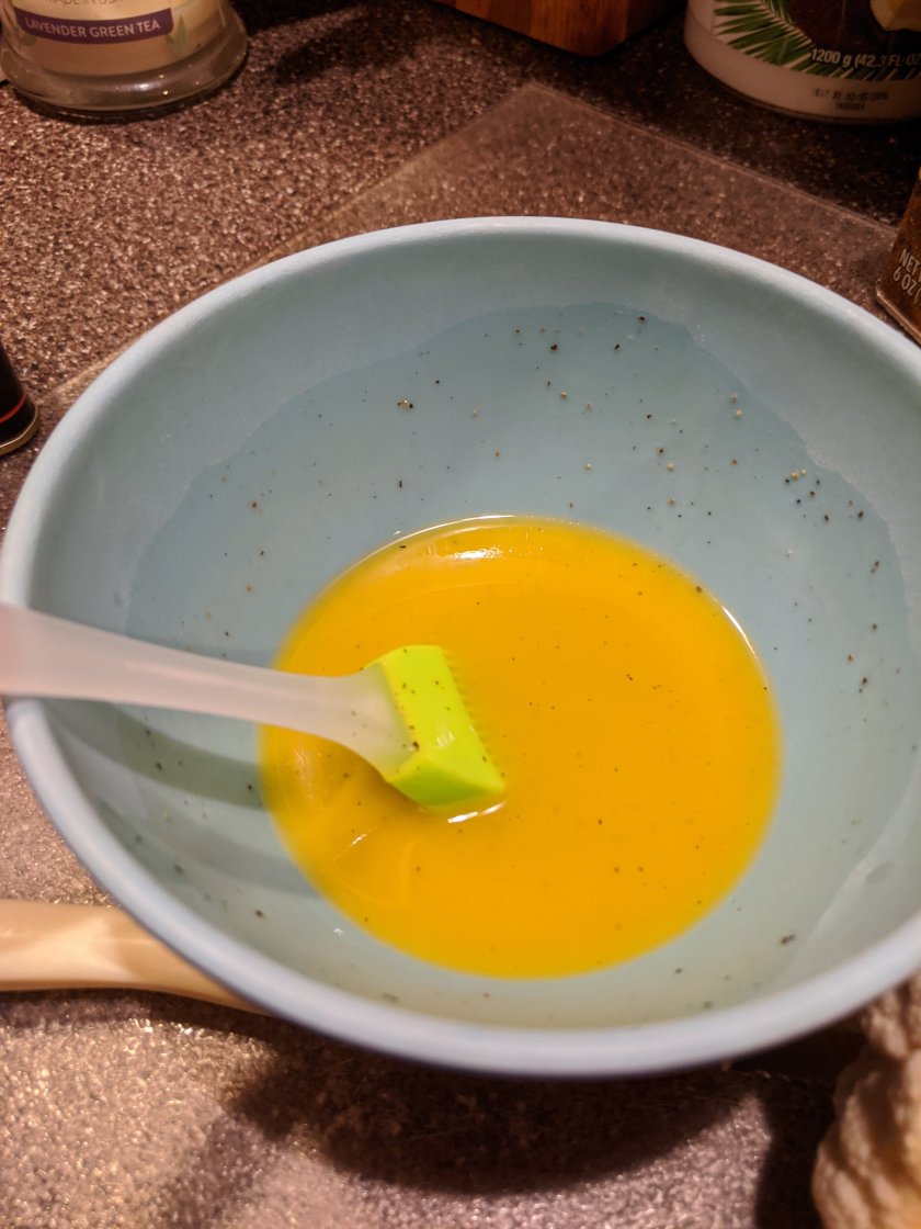 Using a silicon brush, brush an even coat of marinade over the entire cauliflower.