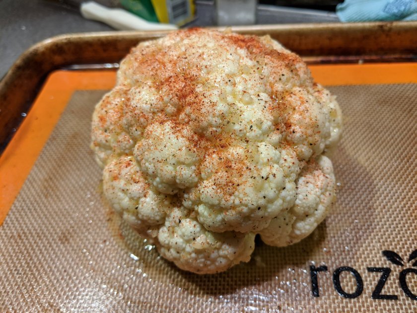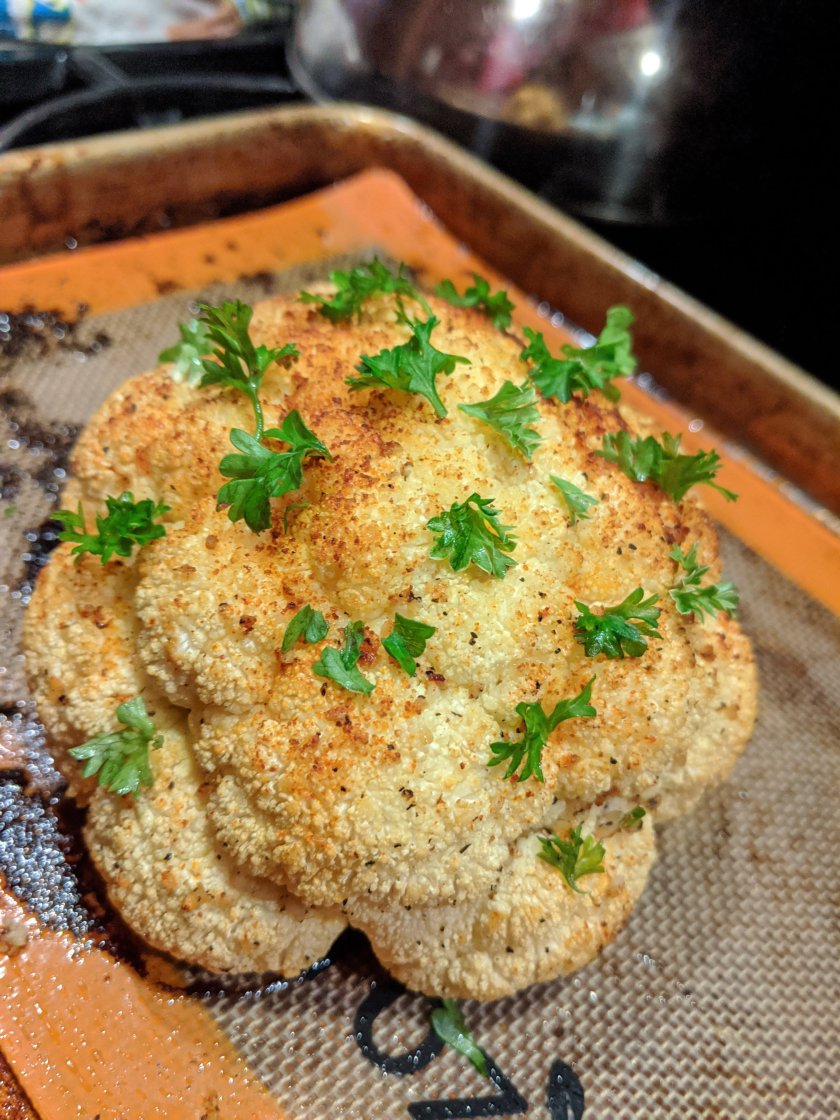 Remove foil and bake for about 10 more minutes. If your cauliflower is larger, leave it a few extra minutes. For a nice crispy exterior, broil on high for 3 minutes.