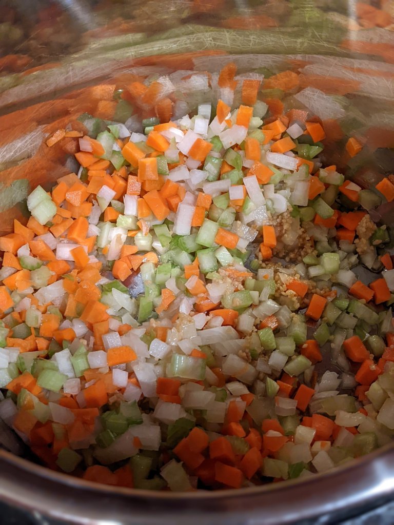 Turn your instant pot to saute mode and add oil, garlic, carrots, celery, and onion.