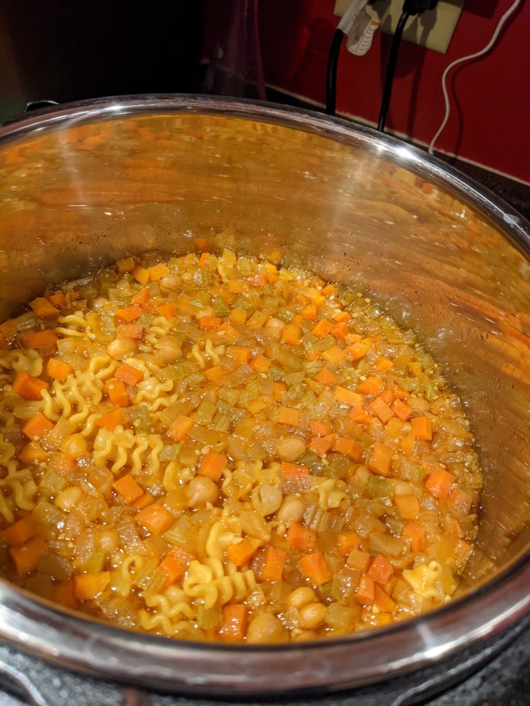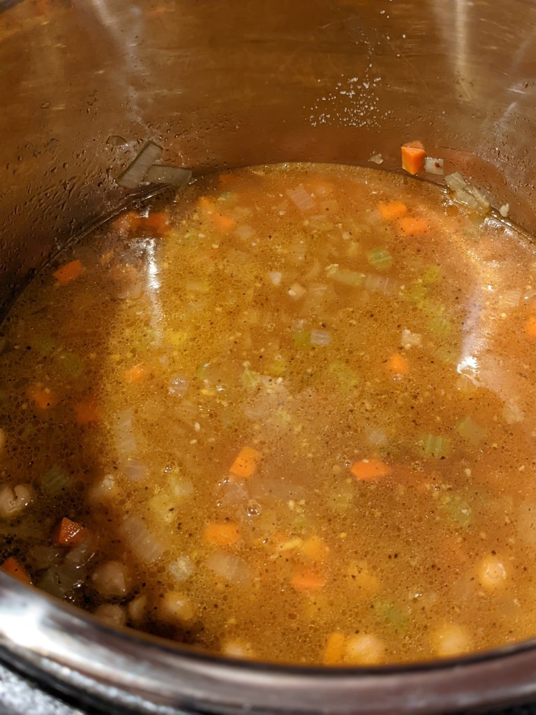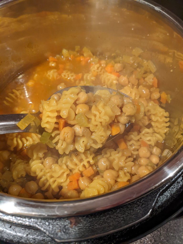 I could eat soup every day, but when fall and winter roll around, it is especially necessary. My family has come down with a bit of a cold this last week and I wanted something that could give that classic chicken noodle soup comfort. I remembered reading that people throw chickpeas in for protein instead of chicken, so I diced up the soup essentials, added a ton of garlic for its antiviral properties, and came up with one of the most delicious soups ever! I chose to make mine in the Instant pot, but if you want to do it on the stovetop, simply follow the same instructions, but cook your noodles beforehand and combine at the end.