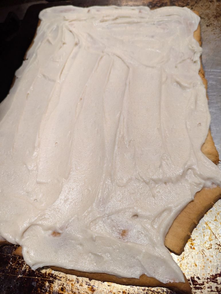 Open crescent rolls and lay them flat on a greased baking sheet. Piece them together like a puzzle if you need to, because it doesn’t need to be perfect! Bake according to package directions. Allow to cool completely.