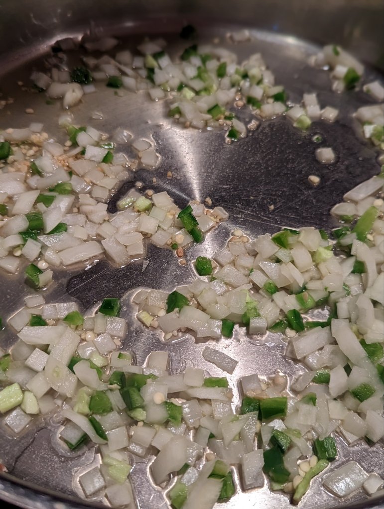 Heat oil in a large skillet. Add onion, garlic, and jalapeno and cook for about 4 minutes.