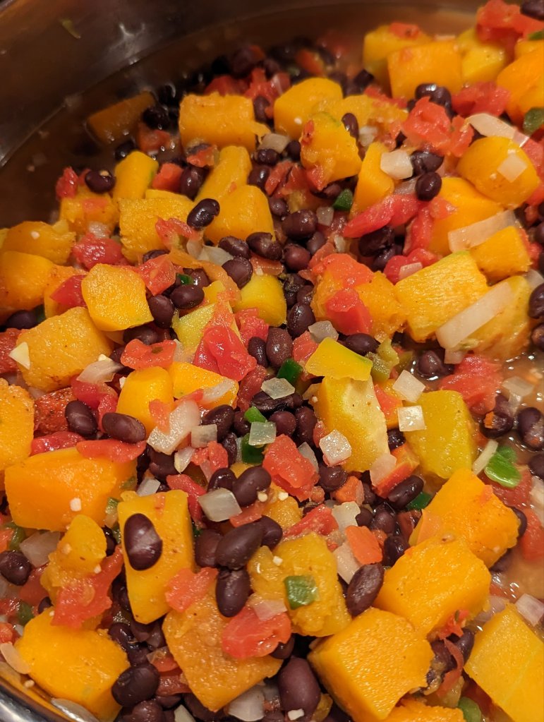 Add butternut squash, Rotel, black beans, water, chili powder, salt, and pepper.