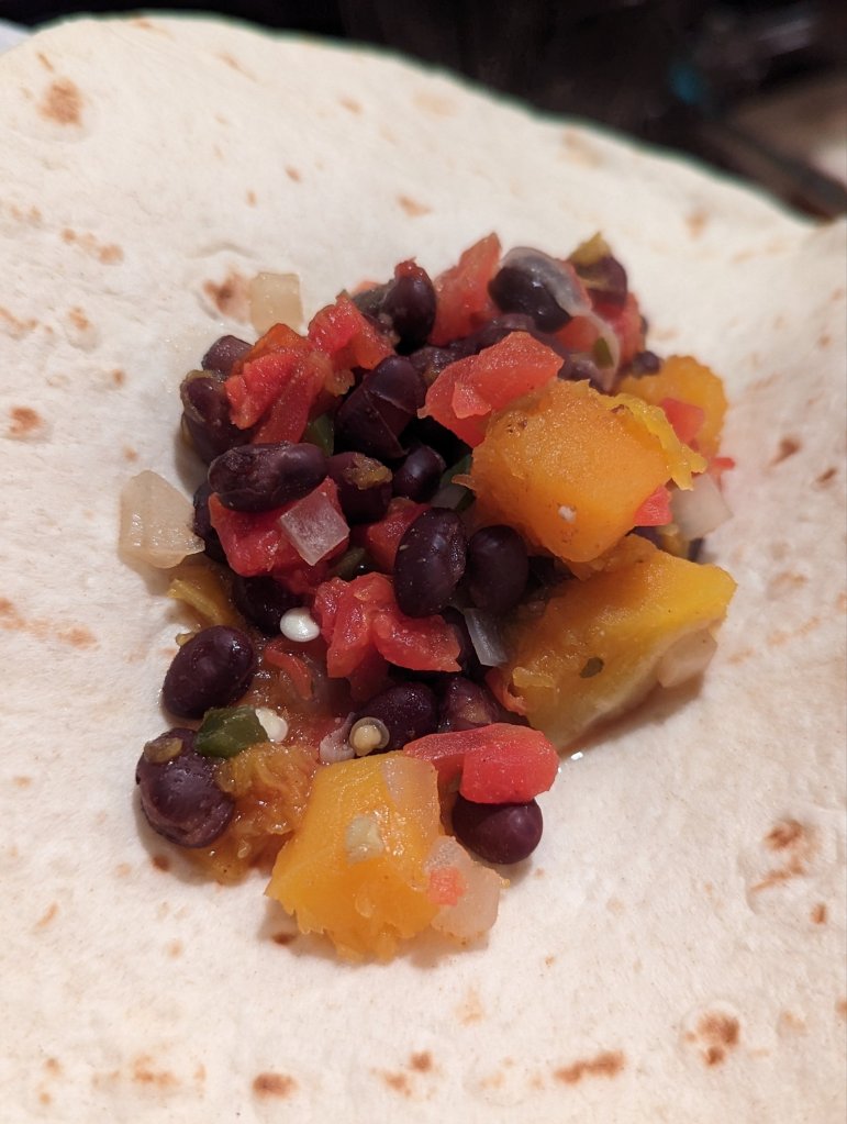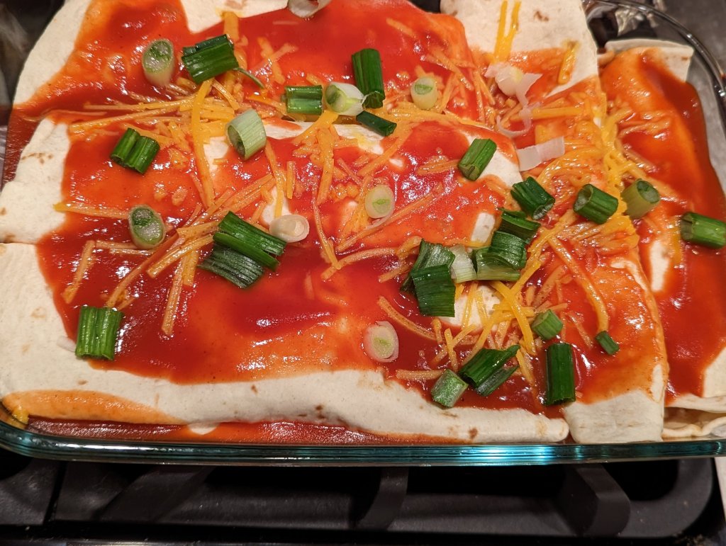 Place a heaping spoonful into the center of a tortilla and carefully roll it. Gently place in baking dish with the “seam” side down. Repeat for the remainder of filling.